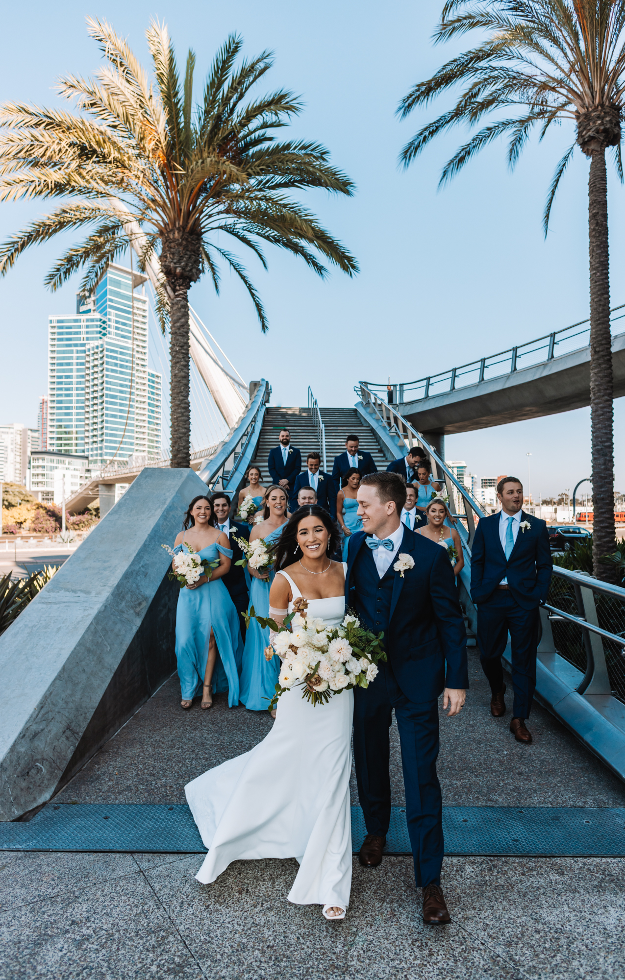 San Diego Bride and Groom travel through downtown before their Wedding Ceremony at Coastera. Wedding Photography suggested and feature the Harbor Pedistrian Bridge in downtown San Diego for award winning photography by Brandon Colbert Photography.