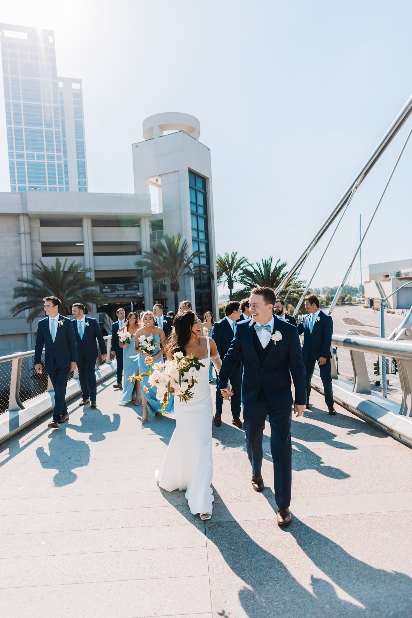 San Diego Bride and Groom travel through downtown before their Wedding Ceremony at Coastera. Wedding Photography suggested and feature the Harbor Pedistrian Bridge in downtown San Diego for award winning photography by Brandon Colbert Photography.
