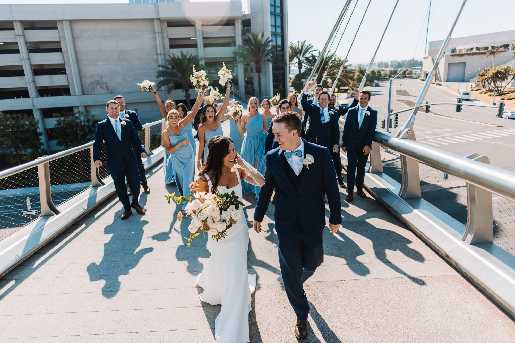 San Diego Bride and Groom travel through downtown before their Wedding Ceremony at Coastera. Wedding Photography suggested and feature the Harbor Pedistrian Bridge in downtown San Diego for award winning photography by Brandon Colbert Photography.