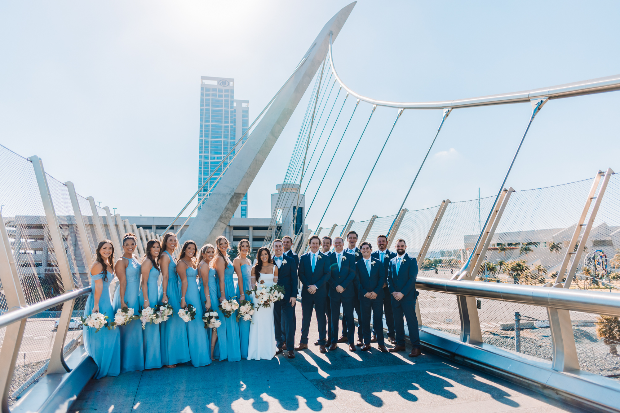 San Diego Bride and Groom travel through downtown before their Wedding Ceremony at Coastera. Wedding Photography suggested and feature the Harbor Pedistrian Bridge in downtown San Diego for award winning photography by Brandon Colbert Photography.