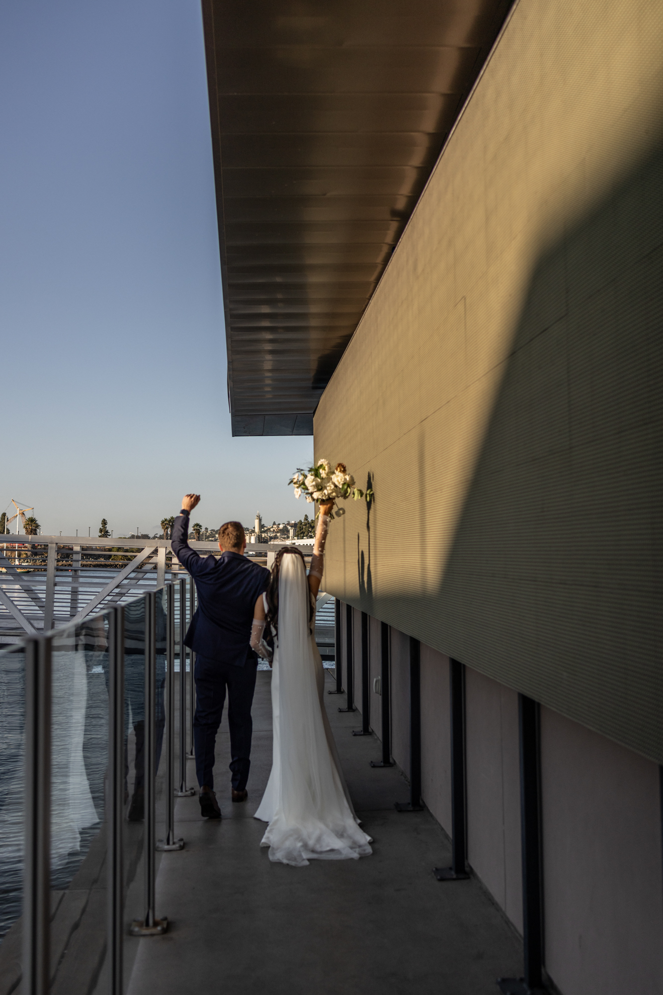 San Diego Bride and Groom travel through downtown before their Wedding Ceremony at Coastera. Wedding Photography suggested and feature the Harbor Pedistrian Bridge in downtown San Diego for award winning photography by Brandon Colbert Photography.