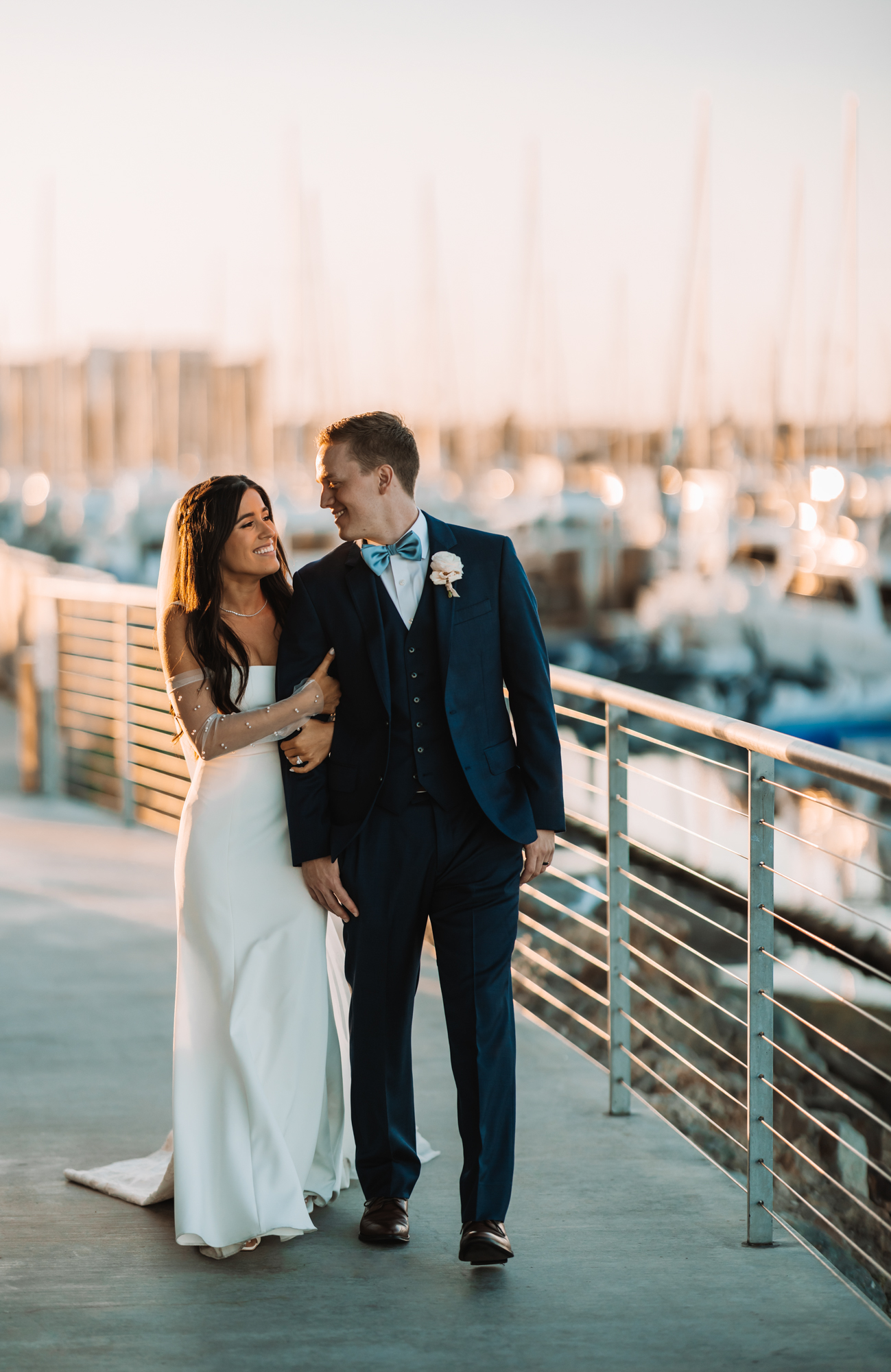 San Diego Bride and Groom travel through downtown before their Wedding Ceremony at Coastera. Wedding Photography suggested and feature the Harbor Pedistrian Bridge in downtown San Diego for award winning photography by Brandon Colbert Photography.