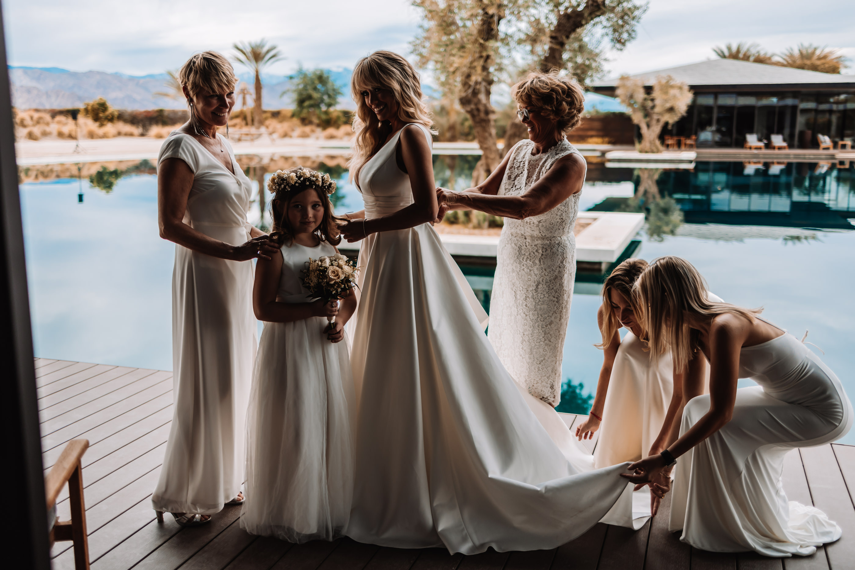 The Luxury Villa, Zenyara is best known as the epic Coachella Exclusive Parties!!! This upscale Wedding Venue makes you feel like your atop of the world! The white sand beach amongst the surrounding mountains and desert was a perfect touch for France and Jesse’s Tulum inspired Wedding Vibe! France and Jesse embraced the landscape and were so easy to communicate with as they trusted me with some of the least obvious backdrops and direction. It was important to the couple that I work quickly and thoroughly so they could enjoy their gust on their special day, and thus I found myself following my festival heart posing them against the European design with a splash of that Palm Springs elegance! Here are a handful of favorites for France and Jesse’s special Wedding Day!