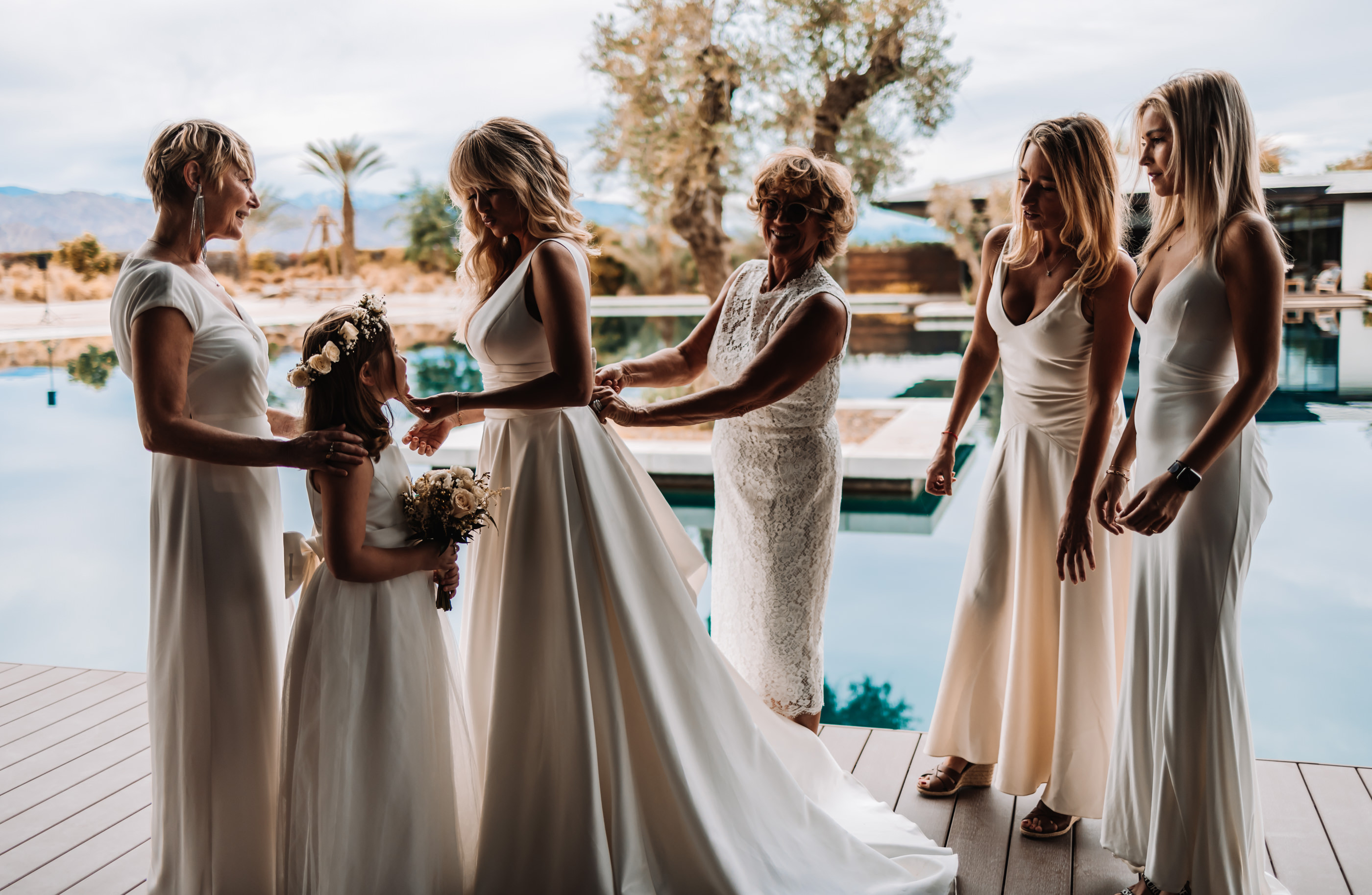 The Luxury Villa, Zenyara is best known as the epic Coachella Exclusive Parties!!! This upscale Wedding Venue makes you feel like your atop of the world! The white sand beach amongst the surrounding mountains and desert was a perfect touch for France and Jesse’s Tulum inspired Wedding Vibe! France and Jesse embraced the landscape and were so easy to communicate with as they trusted me with some of the least obvious backdrops and direction. It was important to the couple that I work quickly and thoroughly so they could enjoy their gust on their special day, and thus I found myself following my festival heart posing them against the European design with a splash of that Palm Springs elegance! Here are a handful of favorites for France and Jesse’s special Wedding Day!