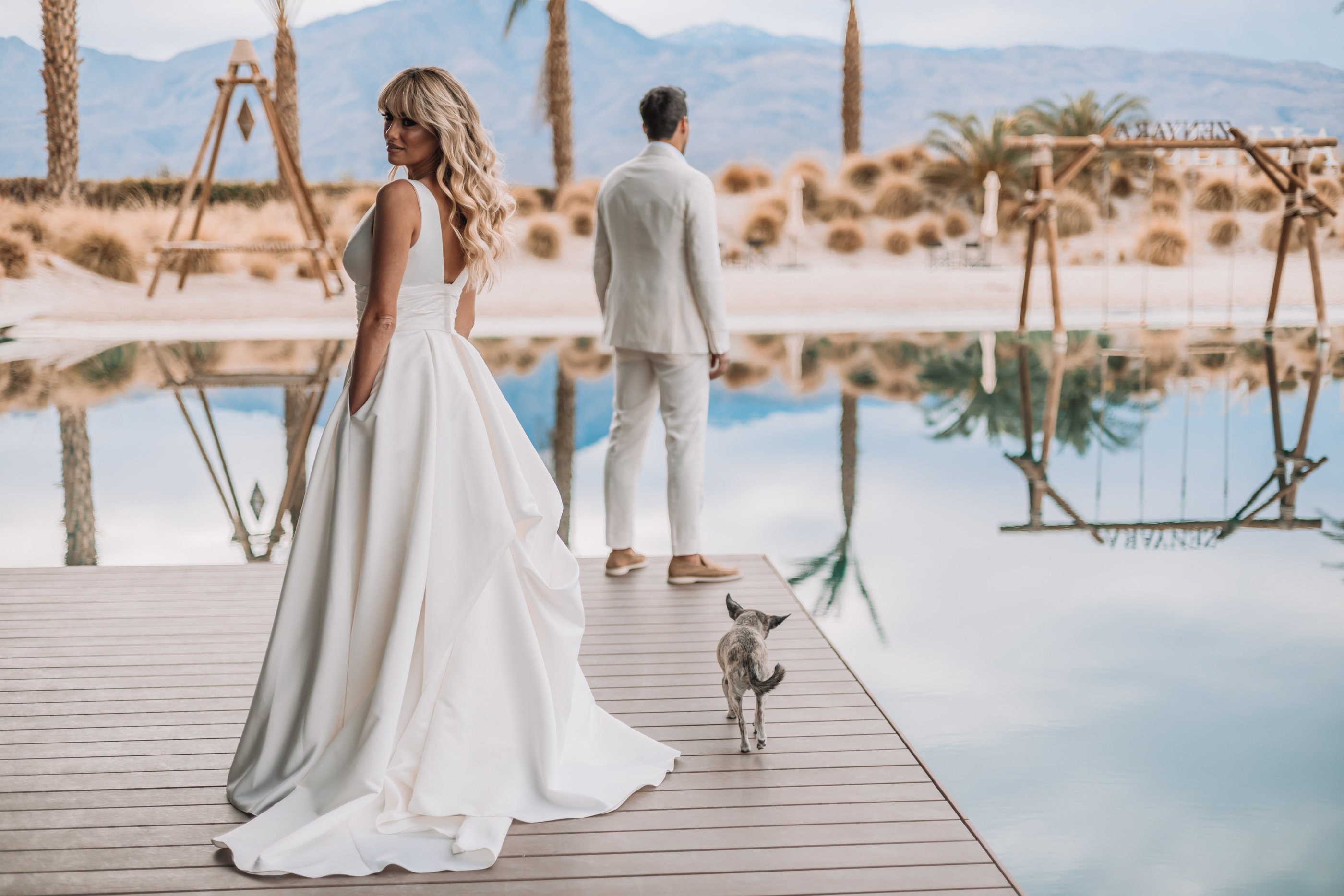 The Luxury Villa, Zenyara is best known as the epic Coachella Exclusive Parties!!! This upscale Wedding Venue makes you feel like your atop of the world! The white sand beach amongst the surrounding mountains and desert was a perfect touch for France and Jesse’s Tulum inspired Wedding Vibe! France and Jesse embraced the landscape and were so easy to communicate with as they trusted me with some of the least obvious backdrops and direction. It was important to the couple that I work quickly and thoroughly so they could enjoy their gust on their special day, and thus I found myself following my festival heart posing them against the European design with a splash of that Palm Springs elegance! Here are a handful of favorites for France and Jesse’s special Wedding Day!