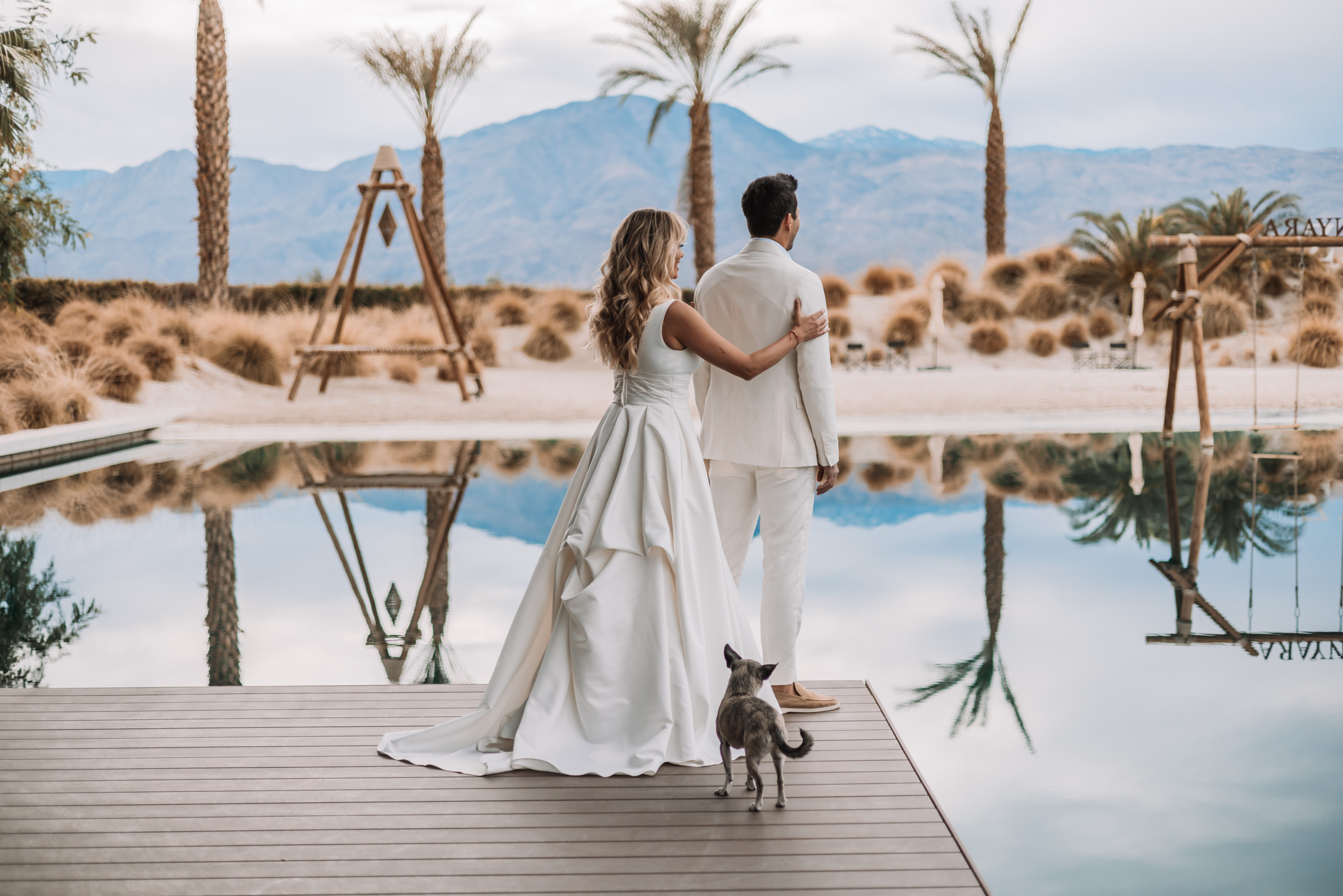 The Luxury Villa, Zenyara is best known as the epic Coachella Exclusive Parties!!! This upscale Wedding Venue makes you feel like your atop of the world! The white sand beach amongst the surrounding mountains and desert was a perfect touch for France and Jesse’s Tulum inspired Wedding Vibe! France and Jesse embraced the landscape and were so easy to communicate with as they trusted me with some of the least obvious backdrops and direction. It was important to the couple that I work quickly and thoroughly so they could enjoy their gust on their special day, and thus I found myself following my festival heart posing them against the European design with a splash of that Palm Springs elegance! Here are a handful of favorites for France and Jesse’s special Wedding Day!