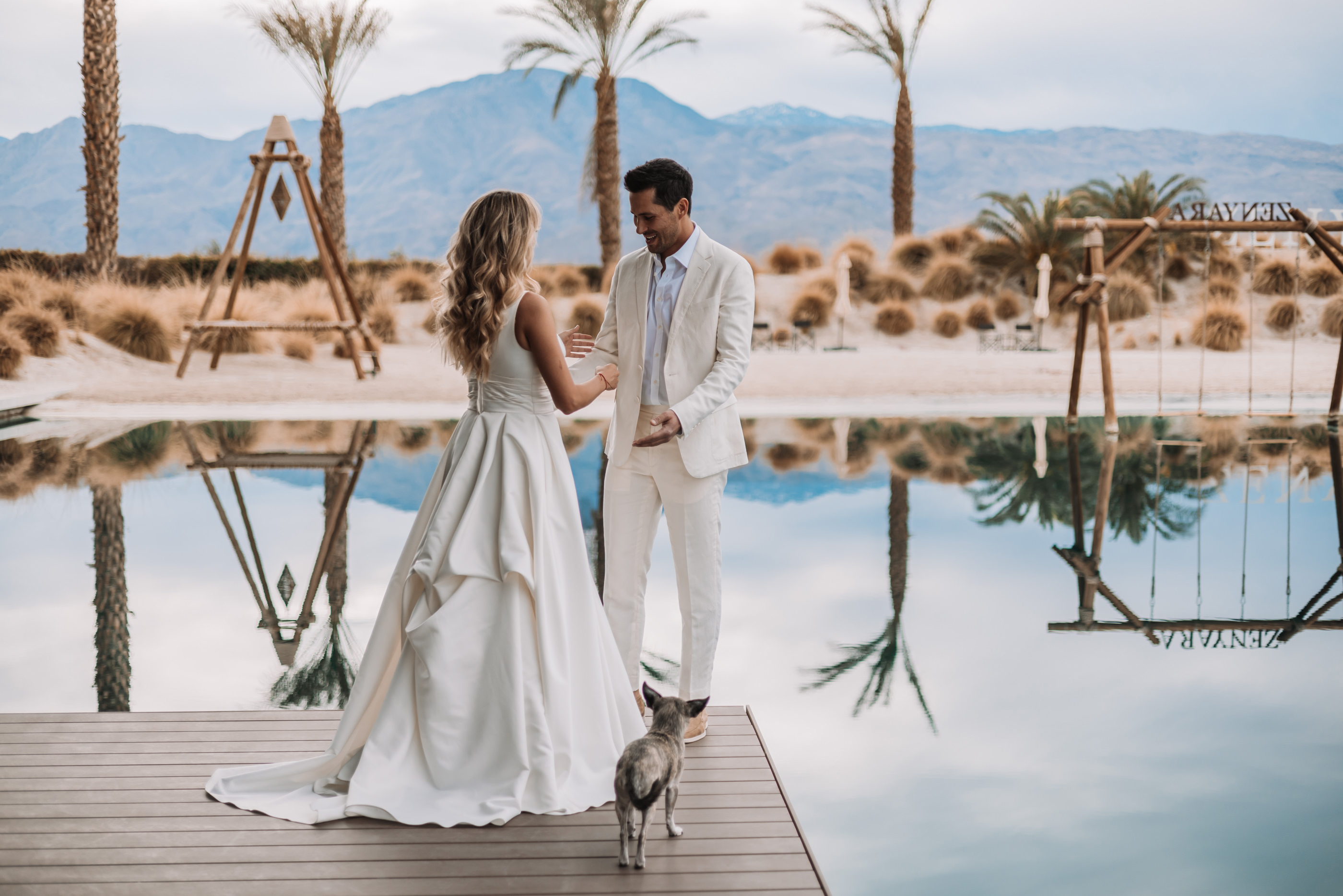 The Luxury Villa, Zenyara is best known as the epic Coachella Exclusive Parties!!! This upscale Wedding Venue makes you feel like your atop of the world! The white sand beach amongst the surrounding mountains and desert was a perfect touch for France and Jesse’s Tulum inspired Wedding Vibe! France and Jesse embraced the landscape and were so easy to communicate with as they trusted me with some of the least obvious backdrops and direction. It was important to the couple that I work quickly and thoroughly so they could enjoy their gust on their special day, and thus I found myself following my festival heart posing them against the European design with a splash of that Palm Springs elegance! Here are a handful of favorites for France and Jesse’s special Wedding Day!