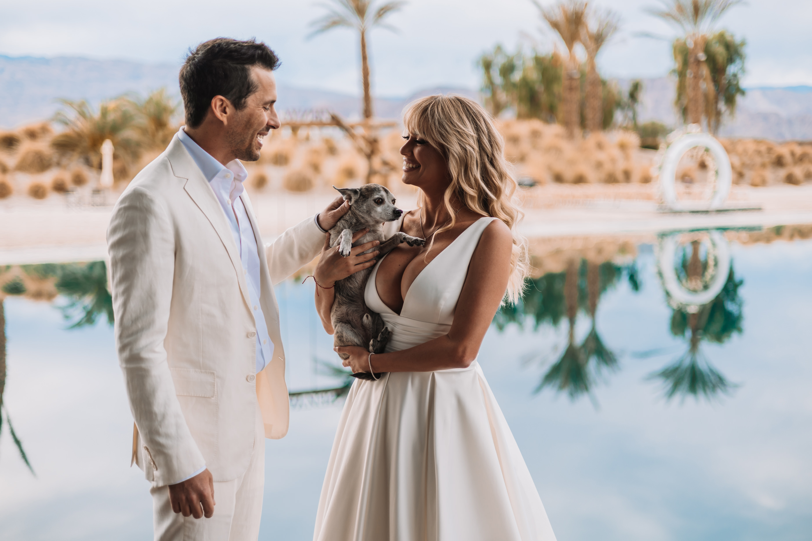 The Luxury Villa, Zenyara is best known as the epic Coachella Exclusive Parties!!! This upscale Wedding Venue makes you feel like your atop of the world! The white sand beach amongst the surrounding mountains and desert was a perfect touch for France and Jesse’s Tulum inspired Wedding Vibe! France and Jesse embraced the landscape and were so easy to communicate with as they trusted me with some of the least obvious backdrops and direction. It was important to the couple that I work quickly and thoroughly so they could enjoy their gust on their special day, and thus I found myself following my festival heart posing them against the European design with a splash of that Palm Springs elegance! Here are a handful of favorites for France and Jesse’s special Wedding Day!