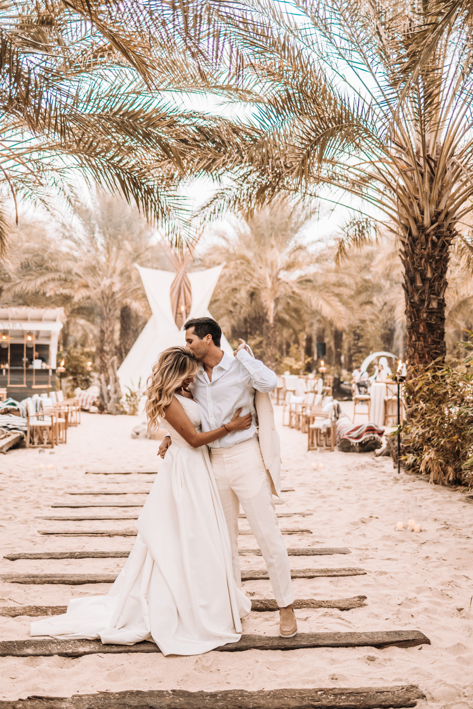 The Luxury Villa, Zenyara is best known as the epic Coachella Exclusive Parties!!! This upscale Wedding Venue makes you feel like your atop of the world! The white sand beach amongst the surrounding mountains and desert was a perfect touch for France and Jesse’s Tulum inspired Wedding Vibe! France and Jesse embraced the landscape and were so easy to communicate with as they trusted me with some of the least obvious backdrops and direction. It was important to the couple that I work quickly and thoroughly so they could enjoy their gust on their special day, and thus I found myself following my festival heart posing them against the European design with a splash of that Palm Springs elegance! Here are a handful of favorites for France and Jesse’s special Wedding Day!